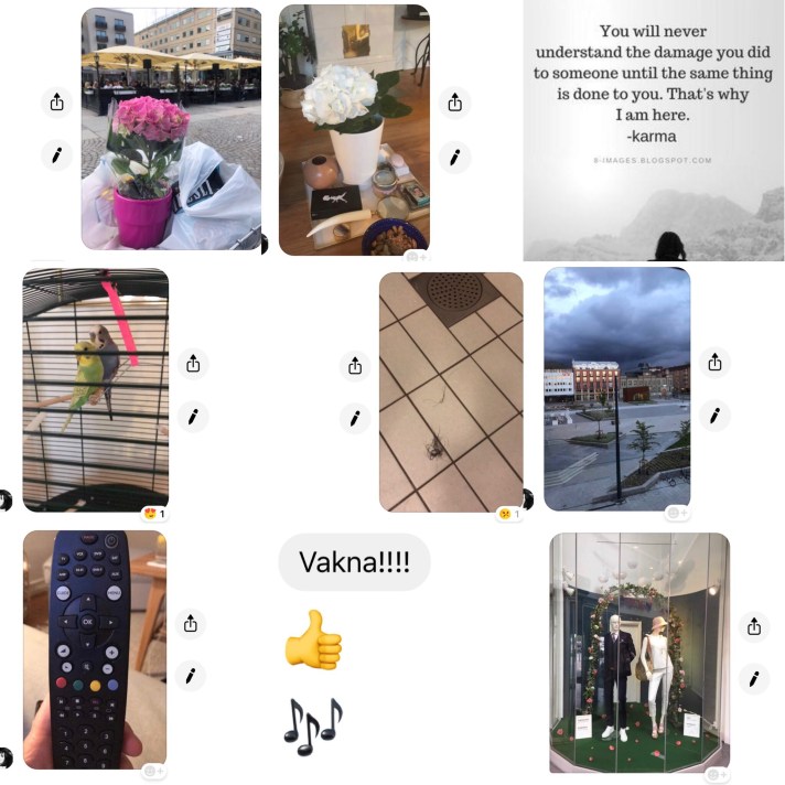 Två muppar på bild… två andra muppar skickas tillbaka… Karma citat… bild på blomma, …bild på annan blomma. Youtube länk på gammalt ligg, …och så en blomma till. Sen kommer en sommarklänning. Sen kommer plötslig en solnedgång från Bolinder och innan dess en rekommendation från Systembolaget… sen kom en länk från en fest… sen kommer inlägg där Cecilia försöker väcka Emma med inlägget ”VAKNA 🎼🎼🎼😊… sen kommer det en bild på ett annat gammalt ligg… sen kommer det jobb bilder: Dekoration i varuhuset… sen, mitt i allt dyker det upp ett brev från Karolinska institutet 😳 JÄTTE VIKTIGT… sen kommer bilder på Cecilias nya festkläder… sen kommer Bobbie Lou och Charlie Plutten i buren… lite beskrivning om gästspel som Influencer… helt plötsligt dyker det upp en bild på en fjärrkontroll och Emma försöker, på distans hjälpa till att få igång tv:n… sen hamnade Emma i Köpa-loungemöbel-psykos och skickade MASSA bilder… sen kommer dokumentation: Hur mycket hår tappar man efter en dusch? Cecilia vägrar skicka bild tillbaka och skickar istället ståtlig bild på Nya torget… sen kommer en länk med låten Friends med Carters… sen som toppen på moset ett collage av Emmas ex… så mycket sjuka grejer i detta flöde att det borde bli till film… cyklar, familjebilder, och humor, humor, humor, humor massa humor, blandat med sorg i hjärteroten – Mitt i livet ❤️ Älskade vän ❤️❤️❤️