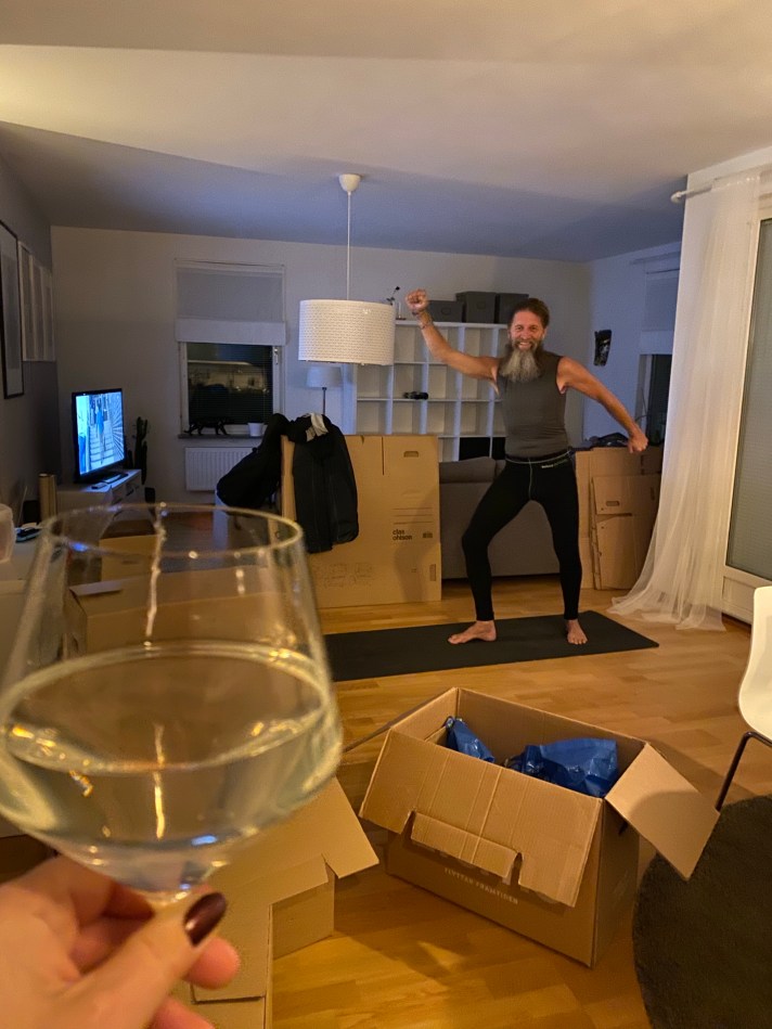 Här och nu i orten, en torsdagskväll. Själv dricker jag The sour project och packar. Henrik fick yoga abstinens och drog på sig det enda som inte är nedpackat: Mitt underställ. Henrik lär bli het(-are) 🙏🏻🔥❤️🥂😍 Namaste