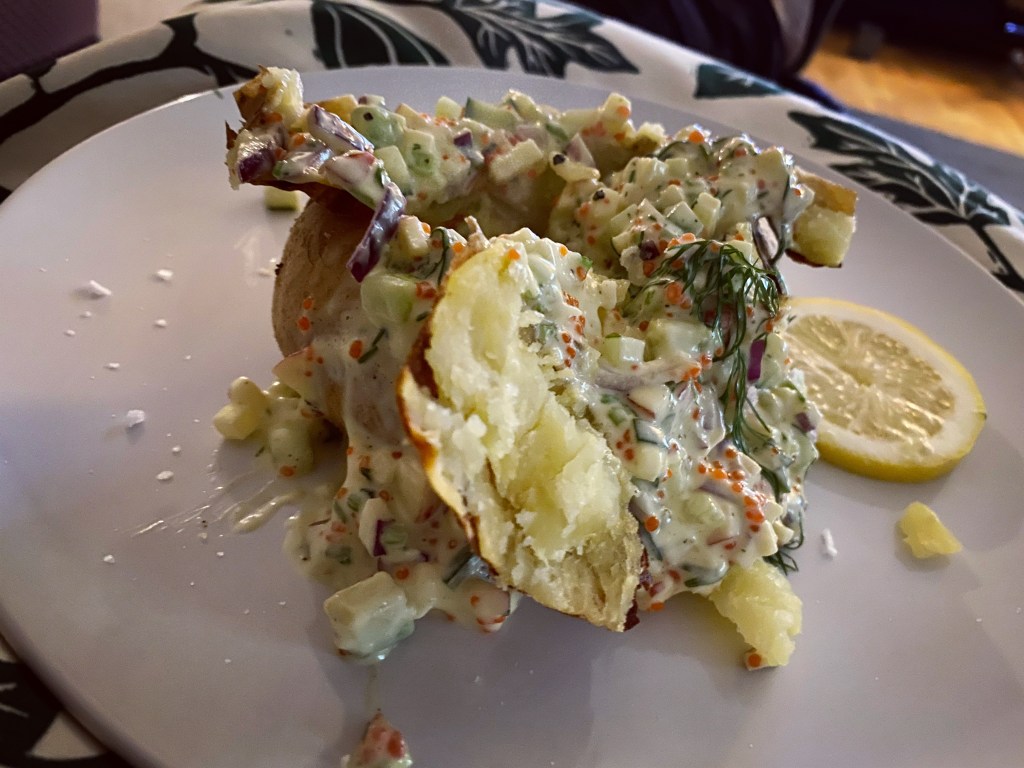 Smarrigt tänkte jag när jag igår såg inslaget från köket.se och igår gjordes det bakad potatis.