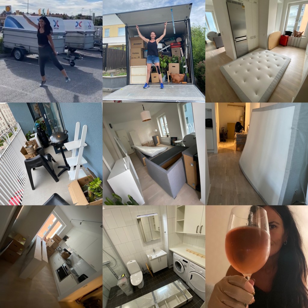 Allt från att surfa ner från flak, där vi aldrig förstod knapparna för att hantera detta flak… till att ligga som en valross med en skiftnyckel i handen mitt i en entré. En dag med många möten. Underbaraste grannarna jag lämnar, som gav mig deras första egenodlade zucchini. Rörd ända ner i tårna. Min hyresvärd som ringde och frågade hur flytten hade gått. Vi mötte även en rediga sur-kärringar till granne som klagade på att vi var i vägen, svarade vänligt ”Vilken tur att flytten snart är klar, så då slipper du mig” 👍🏼 Vi mötte även karaktärer vi aldrig tidigare träffat på och insåg, social kompetens är underskattat. Vi mötte även en man som undrade var männnen var… Det undrar vi med, blev vårat svar. Han talade om för oss att man behandlar kvinnor som blommor. Det som var mest komplicerat under hela dagen var att försöka hitta en kopp kaffe. Nu, nu dricker vi rosé.