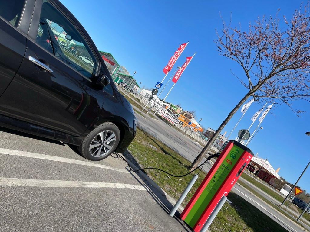 Fortfarande kvar på plats 1 i telefonkön: Sätter mig och kör mot ICA Maxi parkeringen. Voilà! Med pepp och skratt både från kundtjänst och live på parkeringen – Jag laddar!