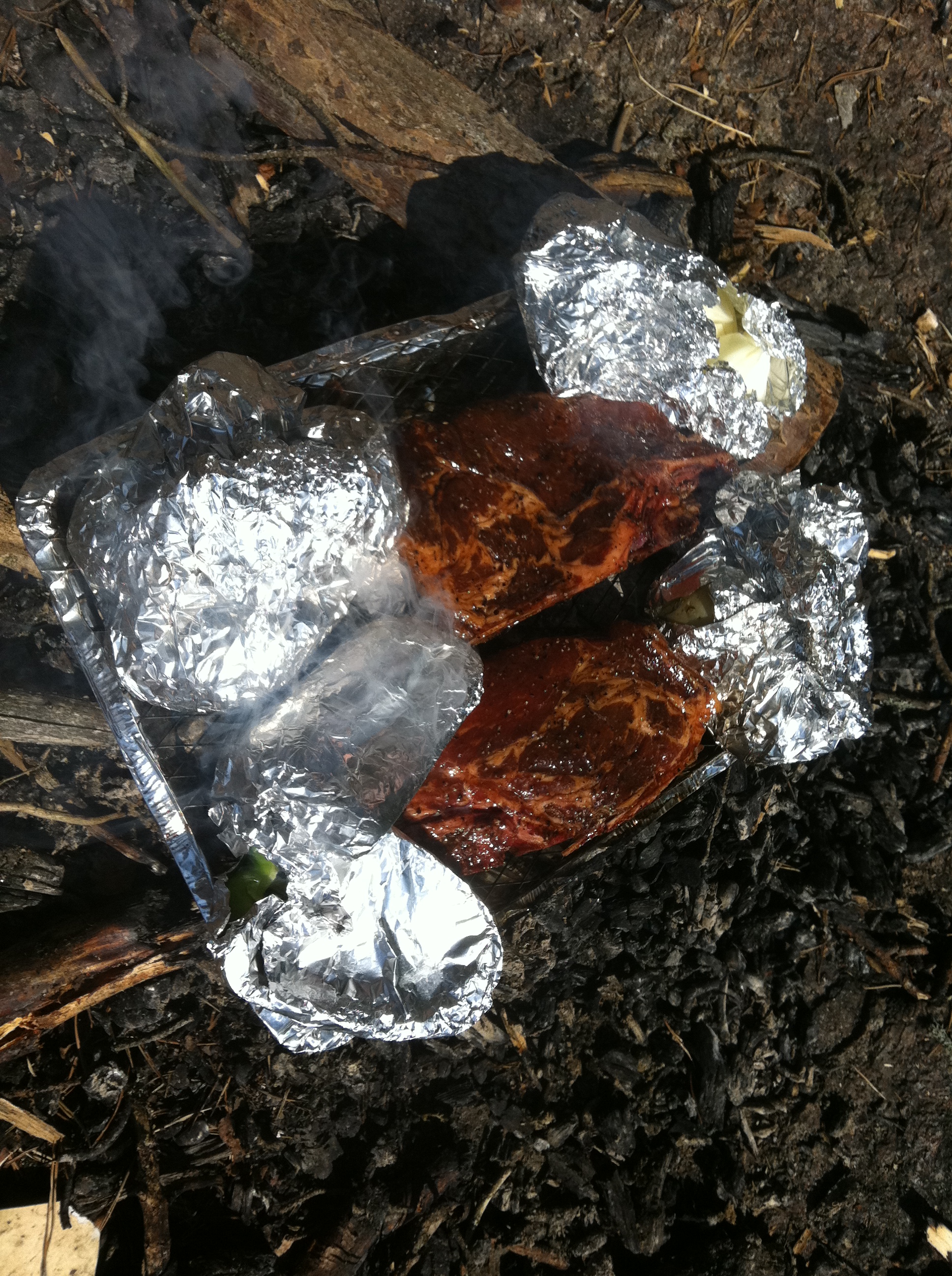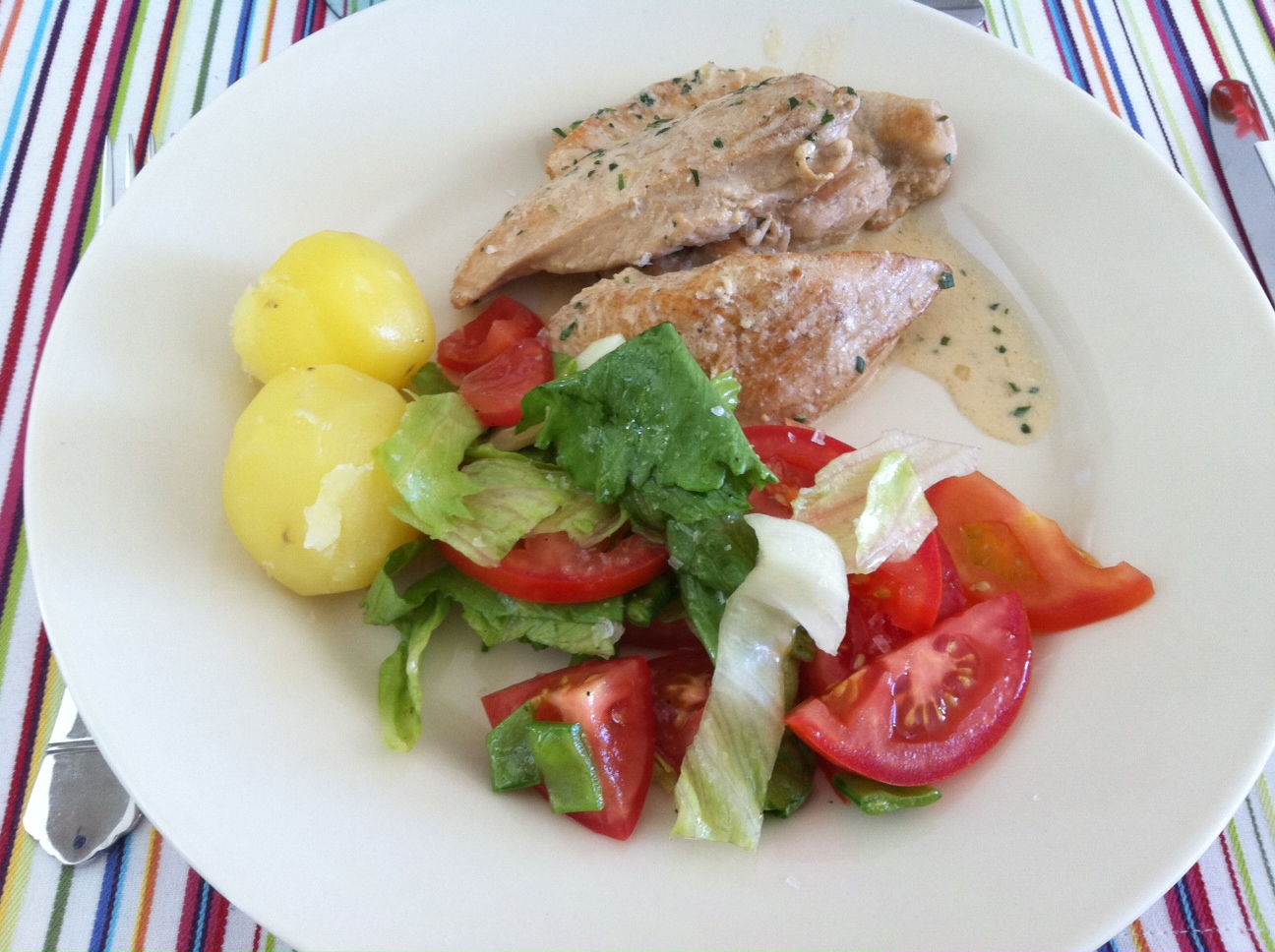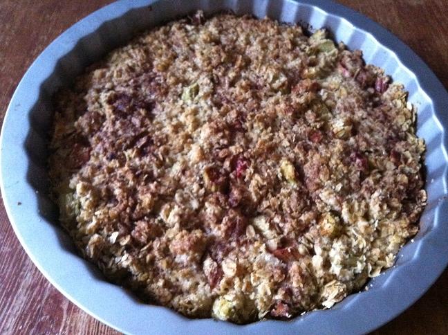 med smörslungad potatis och smulpaj med rabarber på det,